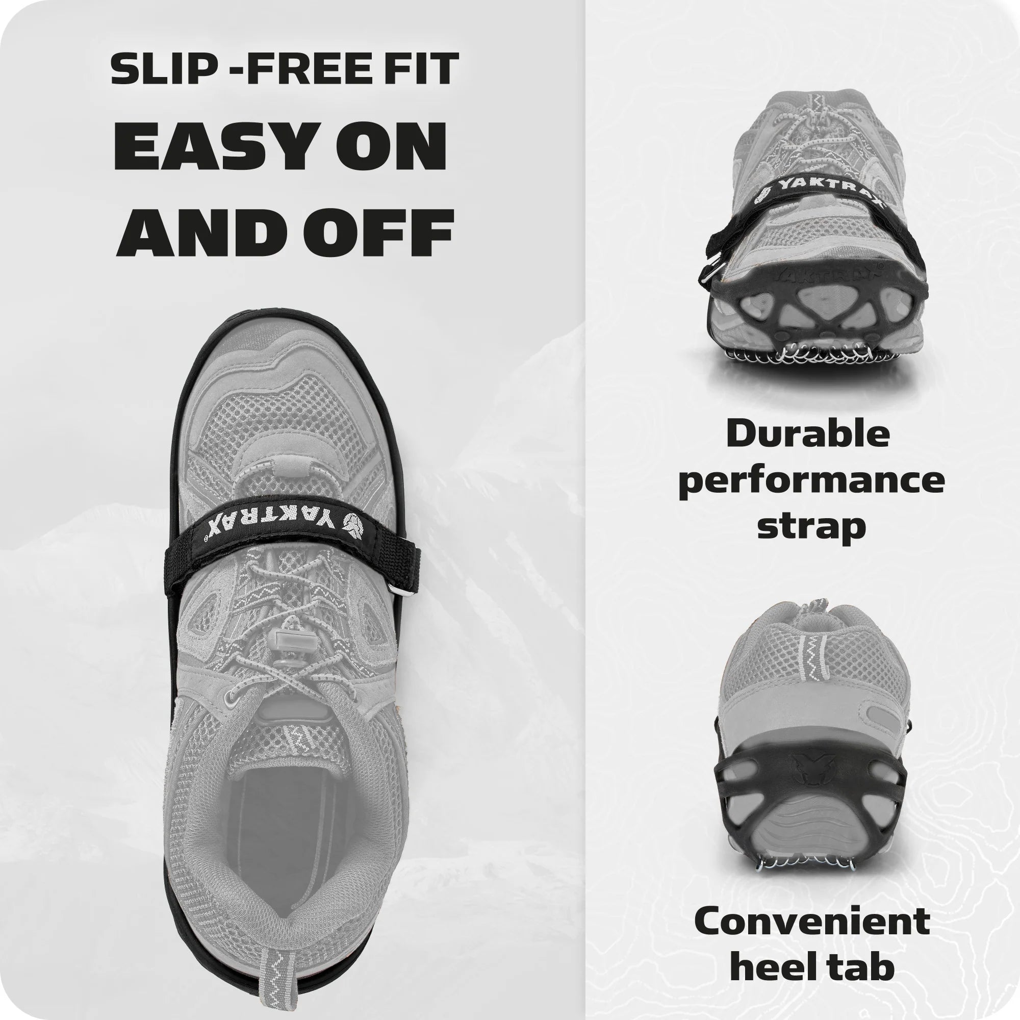 Yaktrax Pro traction cleats instantly provide better traction, confidence and safety for walking, jogging, or hiking on packed snow or ice. The Pro's low-profile, patented coil design provides 360 degrees of traction on slippery ice and snow, giving stability in all directions and allowing users to move about naturally as they would normally have on dry surfaces. Made of high-strength, abrasion and rust-resistant 1.4 mm steel coils and heavy-duty natural rubber, the Pros are durable and easily conform to the shape of any boot or shoe. For oversized shoes or boots, Yaktrax recommends purchasing one size larger than your normal shoe size.